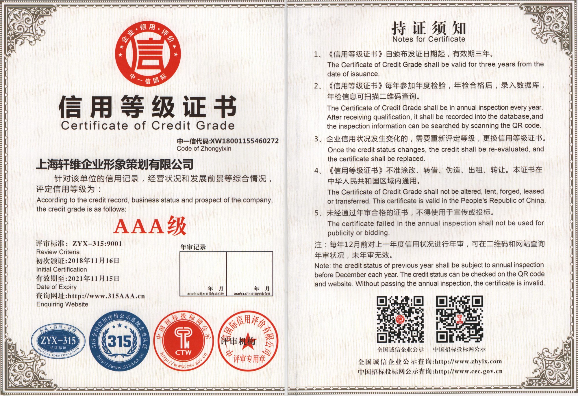3A信用等級證書
